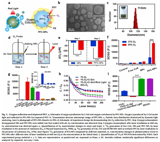 PFC納米顆粒(PFC-NPs)作為氧收集器,將氧富集于光敏劑周圍,提升單線態氧(1O?)產量(圖3f)。