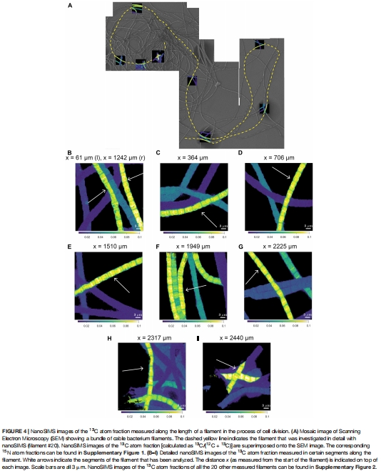 本研究通過結(jié)合雙標(biāo)記穩(wěn)定同位素探測(13C和1?N)、納米二次離子質(zhì)譜(nanoSIMS)、熒光顯微鏡和基因組分析,揭示了電纜細(xì)菌(cable bacteria)獨(dú)特的細(xì)胞周期與生長機(jī)制: