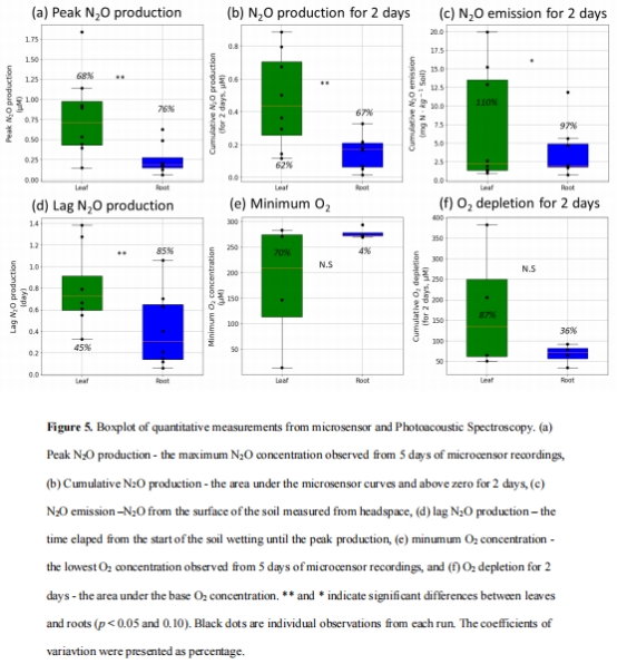 時(shí)間動(dòng)態(tài):柳枝稷葉和根殘?bào)w附近N?O在濕潤后0-12小時(shí)內(nèi)開始產(chǎn)生,葉殘?bào)w峰值更高(約0.6天達(dá)峰),但根殘?bào)w啟動(dòng)更快(0.41天 vs 葉0.92天)(圖5)。