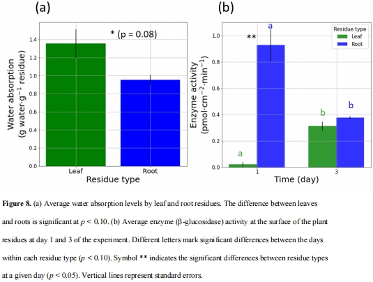 機(jī)制差異:葉殘?bào)w因更高氮含量(1.90% vs 根0.58%)和吸水量(1.4 g水/g生物量 vs 根1.0 g)導(dǎo)致N?O產(chǎn)量更高;根殘?bào)w因表面初始β-葡萄糖苷酶活性高40倍而啟動(dòng)更快(圖8)。