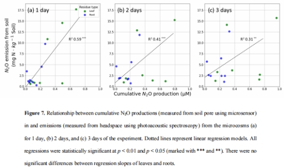 技術(shù)驗(yàn)證:微傳感器測(cè)得的N?O產(chǎn)量與土壤整體排放量顯著正相關(guān)(R2>0.41),證實(shí)其在N?O熱點(diǎn)研究中的有效性(圖7)。