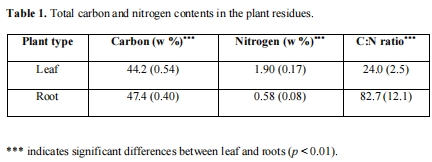 葉殘?bào)wC:N比(24.0)顯著低于根(82.7),氮含量高3倍(表1)。