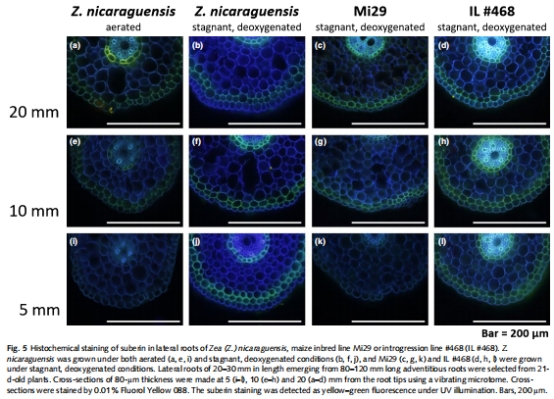 ROL屏障的誘導性:在缺氧停滯條件下,野生種和滲入系的側根基部形成強效ROL屏障,而栽培玉米(Mi29)無此能力(圖2,4)。