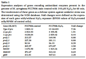 轉錄組分析顯示,H?O?脅迫下藻細胞上調抗氧化基因(如Ⅱ型過氧化物還原酶prx,7.36倍)和毒素-抗毒素系統(如doc基因30倍上調),但下調光合作用基因(如cpcA下調92%)(表1,圖3)。
