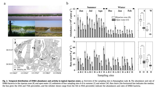 ? 數據:河岸帶DNRA速率(35.28±5.56 nmol N g?1 h?1)為開闊水域的2倍,夏季速率高于冬季。