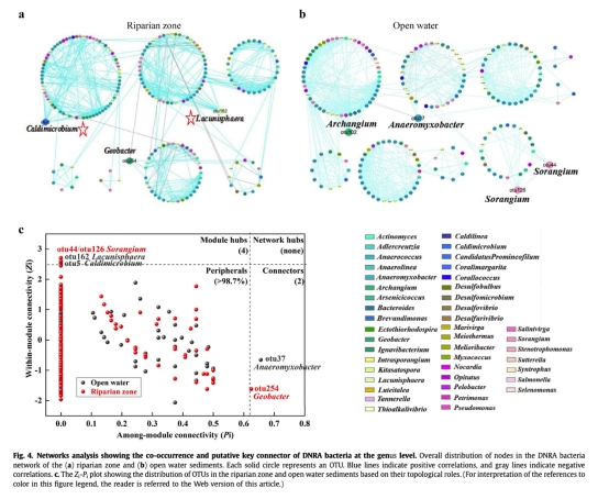 ? 數據:優勢菌屬Anaeromyxobacter(35.11%)與DNRA速率無顯著相關;共現網絡顯示河岸帶關鍵連接菌為Caldimicrobium和Lacunisphaera。