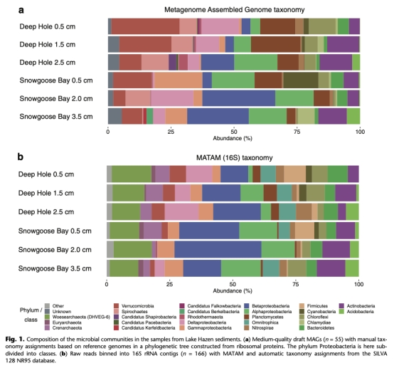 研究通過高通量宏基因組測序分析了高北極最大湖泊哈森湖(Lake Hazen)沉積物中的微生物群落。結果表明: