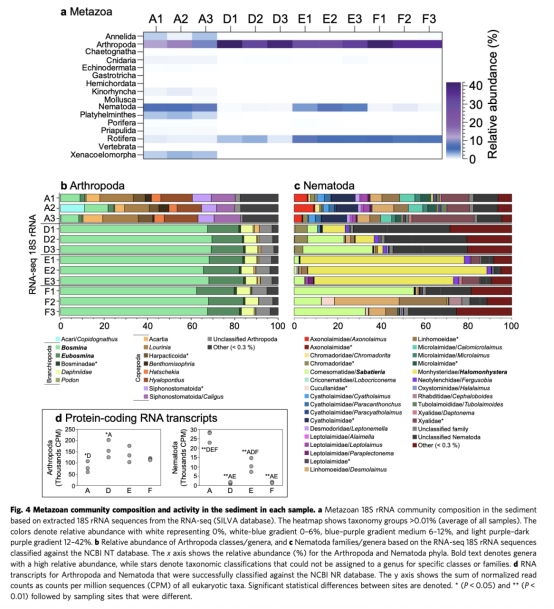 研究首次結(jié)合地球化學(xué)、顯微鏡和RNA測(cè)序技術(shù),分析了全球最大死區(qū)(波羅的海)沉積物沿氧氣梯度的微型后生動(dòng)物分類群和代謝功能。發(fā)現(xiàn)線蟲(chóng)在氧氣濃度低于1.8 μmol L?1時(shí)仍保持代謝活性,其多樣性和群落結(jié)構(gòu)在低氧區(qū)域存在顯著差異,可能與硫化氫(H?S)毒性及其被氧氣或硝酸鹽氧化的潛力相關(guān)。浮游動(dòng)物休眠階段主導(dǎo)后生動(dòng)物群落,其可能利用細(xì)胞色素c氧化酶(COX)作為氧傳感器來(lái)解除休眠狀態(tài)。研究揭示了動(dòng)物適應(yīng)極端環(huán)境的機(jī)制,這些生物資源對(duì)死區(qū)氧氣條件改善后的再定殖至關(guān)重要。