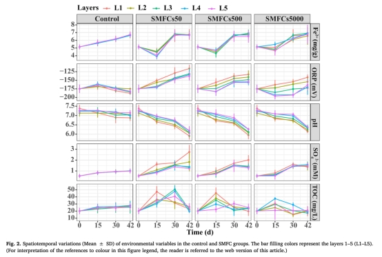 1. SMFCs電流產生導致沉積物中AVS、氧化還原電位(ORP)、pH、Fe2?、總有機碳(TOC)和硫酸鹽等變量形成顯著梯度;