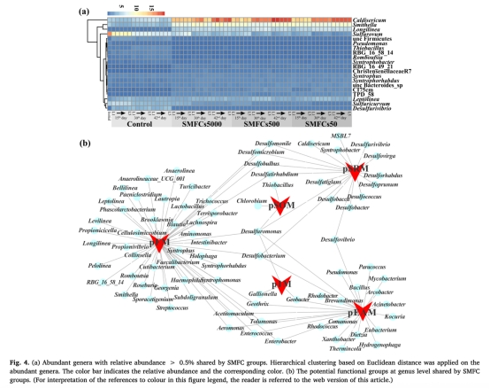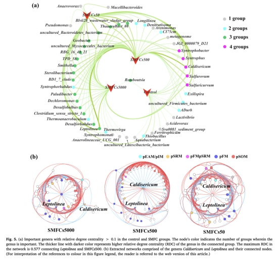 ? 數據:絲狀菌Caldisericum(硫還原菌)和Anaerolineaceae(發酵菌)相對豐度顯著富集(圖4a);SEM顯示陽極表面密布>500μm絲狀菌(圖6a);微生物網絡分析揭示其為核心節點(圖5)。