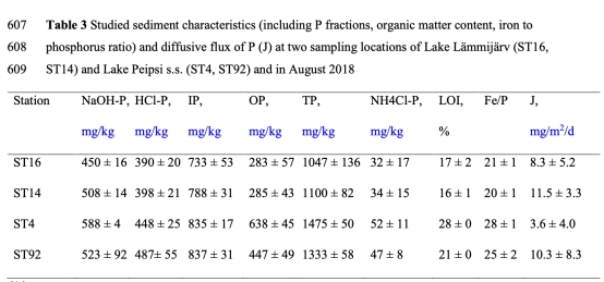3. 沉積物磷組分(表3)