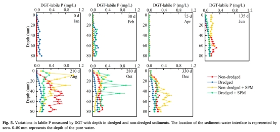 ? 高分辨率剖面(圖2)顯示疏浚(D組)使SWI溶解氧(4.59-8.89 mg/L)顯著高于未疏浚組(ND組3.14-7.82 mg/L),氧滲透深度(OPD)增加,直接驗證疏浚通過移除有機質減少耗氧,創造抑制磷釋放的氧化環境。
