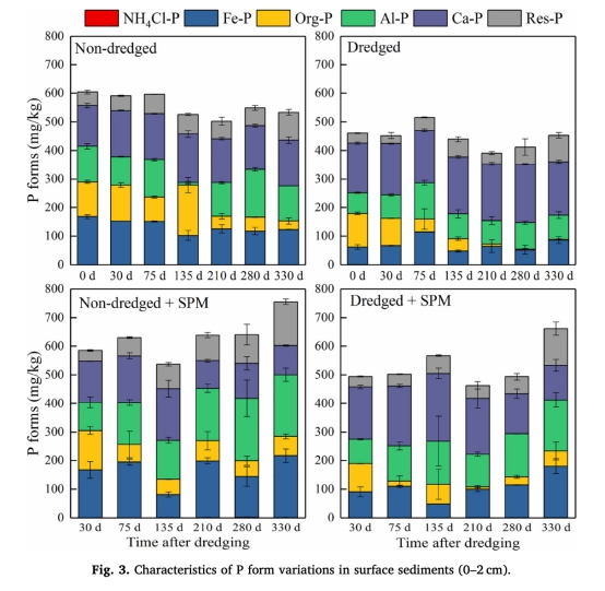 ? 意義:疏浚(D組)使活性磷(NH?Cl-P+Fe-P+Org-P)占比↓,惰性磷(Ca-P+Res-P)占比↑至61.8%;SPM輸入(DS組)逆轉該趨勢,330天后磷形態恢復至未疏浚狀態。