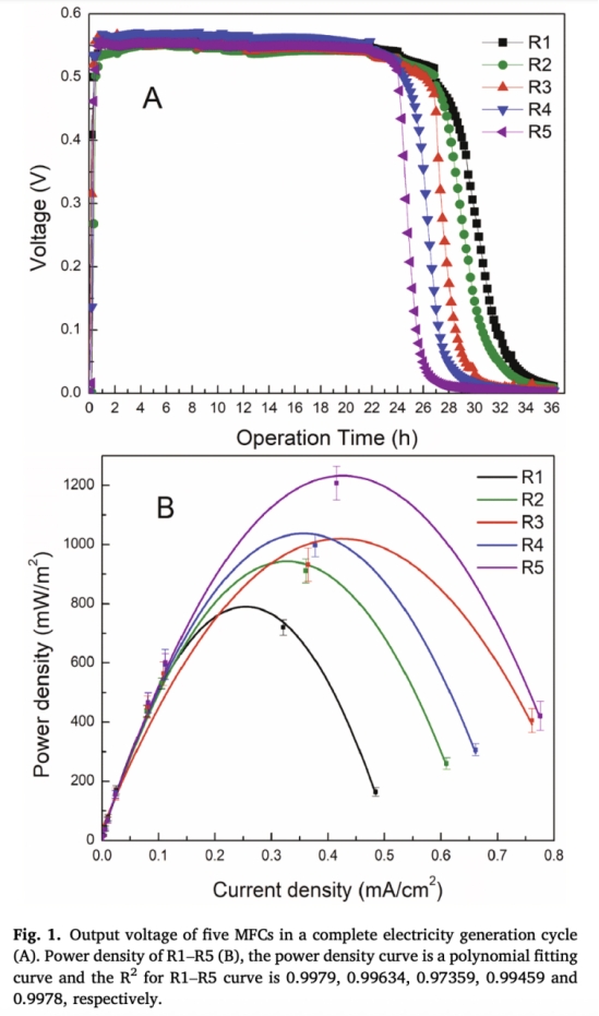 2. 監(jiān)測(cè)長(zhǎng)期運(yùn)行中的輸出電壓(圖1A)、功率密度(圖1B)及污染物去除動(dòng)態(tài)(圖2-4)