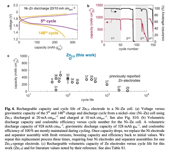 ? 數據:Ni-Zn電池中928 mAh cm?3體積容量循環115次,庫侖效率~100%
