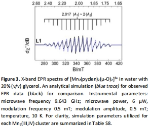 EPR譜顯示[Mn?(pyclen)?(μ-O)?]3?的g=2.0及16線超精細(xì)分裂(圖3)與天然MnCAT酶高度相似,證實(shí)雙核錳中心的關(guān)鍵作用。