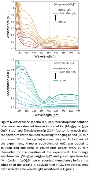 原位UV-Vis證實(shí)[Mn???-(μ-O)?-Mn??]3?二聚體在pyclen體系中可耐受13當(dāng)量H?O?(cyclen僅7當(dāng)量),對(duì)應(yīng)圖7吸光度衰減曲線;
