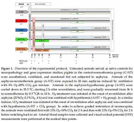 對照組(C-NT)、窒息+常溫(A-NT)、窒息+低溫(A-HT)、A-HT+H?、A-HT+CO?(圖1)。