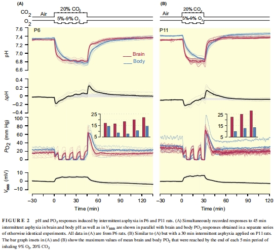 研究通過建立嚙齒動物(大鼠和豚鼠)新生兒窒息模型,模擬出生窒息(缺氧+高碳酸血癥),探究大腦pH和氧分壓(PO?)的動態變化及內源性保護機制。核心發現: