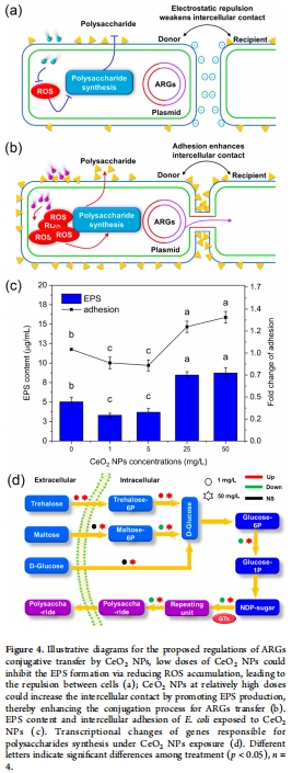 高濃度CeO? NPs(25–50 mg/L):促進ARGs轉移(增加42–53%),機制涉及誘導氧化應激、激活SOS響應、增加EPS合成、提升ATP供應(圖2a, 圖3a, 圖5b)。