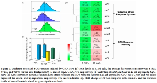 高濃度CeO? NPs(50 mg/L):ROS↑90%,SOD/CAT活性↓,SOS基因(lexA/recA)↑2倍(圖3a–c)。