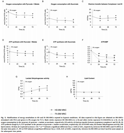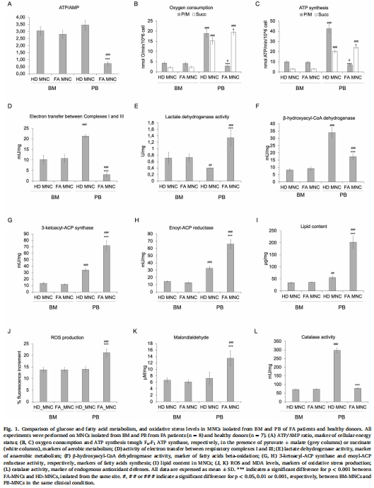 血液FA-MNCs:ATP/AMP↓(圖1A)、復(fù)合物I-III電子傳遞↓(圖1D)、耗氧量↓(圖1B)、乳酸脫氫酶↑(圖1E)、脂質(zhì)積累↑(圖1I)、ROS↑(圖1J)、抗氧化酶↓(圖1L)。