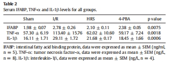 I/R組Chiu評分↑↑(5.67 vs Sham 1.33)、血清IFABP↑(2.78 vs 1.98 ng/ml)、TNF-α↑(113.4 vs 57.3 ng/L)、IL-1β↑(29.11 vs 16.11 ng/L)。
