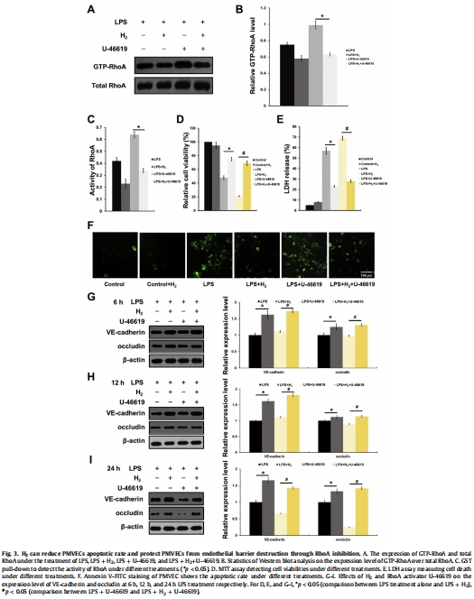 數據:RhoA激活劑U-46619加劇LPS的損傷效應(凋亡率↑120%),而H?完全逆轉此效應(圖3D-F)。