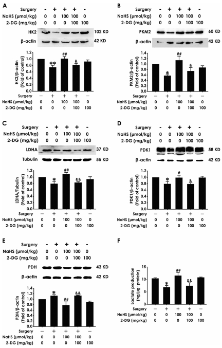 沃伯格效應:Western blot測糖酵解酶(HK2/PKM2/LDHA/PDK1/PDH,圖5A-E),乳酸試劑盒測乳酸水平(圖5F)。