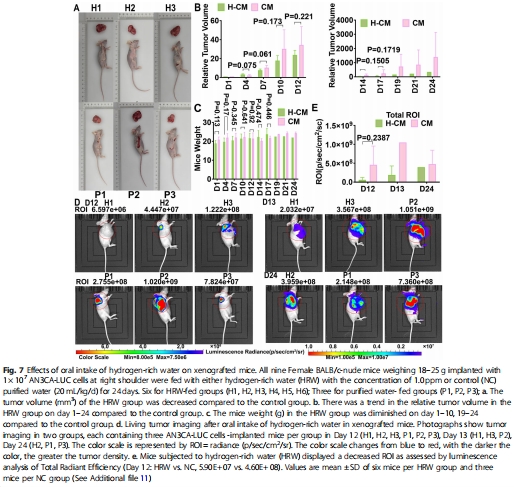 富氫水組小鼠腫瘤體積減小(圖7a-b),活體成像顯示輻射強度(ROI)降低(圖7d-e)。
