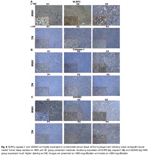 體內效果:飲用富氫水(HRW)的小鼠腫瘤體積和重量顯著減小(圖7a-c),腫瘤組織NLRP3/caspase-1/GSDMD表達升高(圖8)。