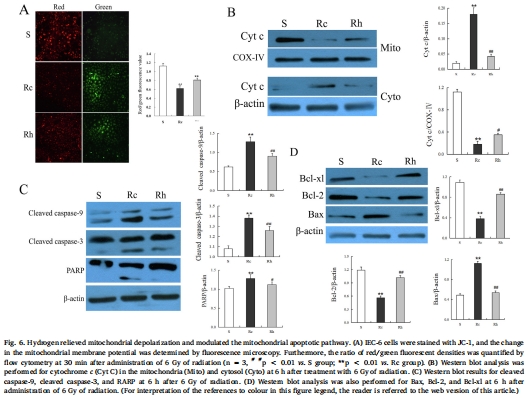 輻射損傷模型(6 Gy IEC-6細(xì)胞):檢測(cè)ROS(DCFH-DA/DHE,圖4)、細(xì)胞凋亡(Annexin V/PI,圖5D)、線(xiàn)粒體功能(JC-1,圖6A)及凋亡蛋白(Bax/Bcl-2/cytochrome c,圖6B-D)。