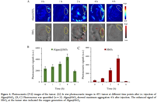 多模態成像:葉綠素賦予Algae@SiO?光聲(PA)和熒光(FI)雙模成像能力,實現腫瘤靶向監測(圖4)。