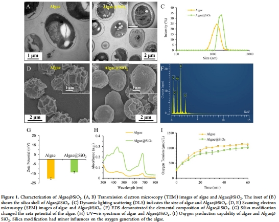 生物礦化修飾:以F127為模板,TEOS/APTES水解在藻表面形成100-200 nm二氧化硅殼(Algae@SiO?),提升穩定性并降低細胞毒性(圖1A-G)。
