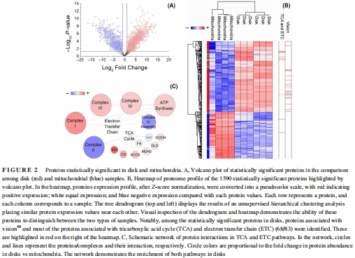 本研究通過蛋白質組學與功能分析,揭示了視網膜桿狀外節(OS)盤膜(無傳統線粒體)進行氧化磷酸化(OxPhos)的分子機制: