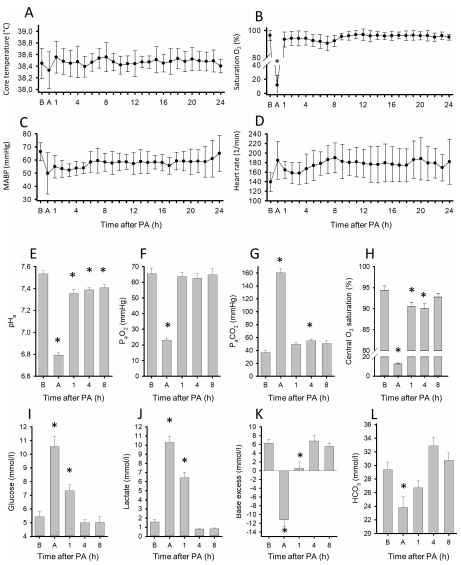 PA期間:PaO?從65±4降至23±1 mmHg(缺氧),PaCO?從37±3升至160±6 mmHg(高碳酸血癥),乳酸從1.6±0.3升至10.3±0.7 mmol/L(代謝性酸中毒),動脈血pH(pHa)從7.53降至6.79。