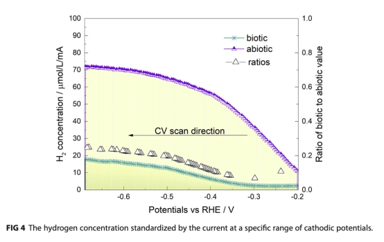 4. 結合微傳感器與循環伏安法,在不同陰極電位下同步測量氫濃度和電流的變化,對比有生物膜( biotic)和無生物膜(abiotic)條件下的差異。