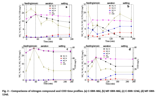 2 圖2-3顯示N?O主要在好氧階段產(chǎn)生(與NO??積累相關(guān)),且MF-SBR周期內(nèi)N?O排放量更低,表明磁場抑制了硝化過程N(yùn)?O生成并促進(jìn)反硝化還原。