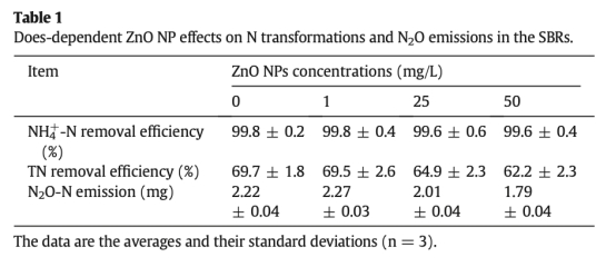 1. ZnO NPs對反硝化過程產生劑量依賴性抑制,降低TN去除效率和N2O排放,但對硝化過程影響不顯著。