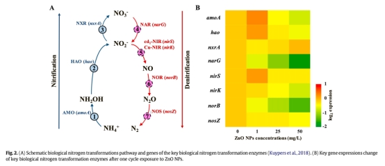 2. N2O排放數(shù)據:氣體N2O排放通量(來自圖1D)。研究意義:表明ZnO NPs降低N2O排放,且與NO2-N積累正相關,揭示NPs對反硝化途徑的影響。