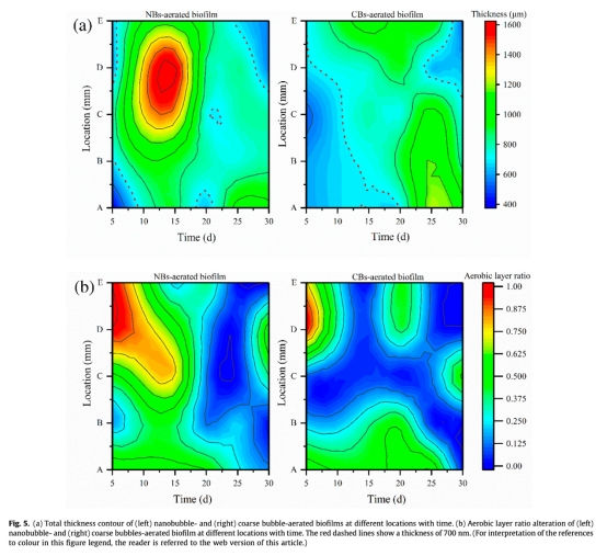 5 生物膜生長參數:厚度和好氧層比例隨時間變化(圖5a-b)。研究意義:NB曝氣加速生物膜同步增厚(最大厚度1188μm),好氧層比例更高(64.4%),說明氧滲透深度大,微生物活性分布均勻。