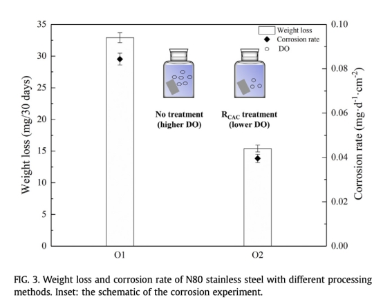 2. 腐蝕速率:來自Fig. 3,N80不銹鋼在處理后廢水中腐蝕速率降低超過兩倍(從0.084 mg·d?1·cm?2降至0.039 mg·d?1·cm?2),意義在于驗證DO去除對腐蝕的抑制作用。
