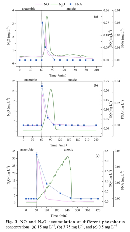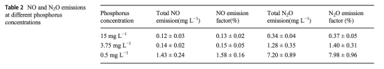 3. NO和N?O排放總量與排放因子(來自圖4和表2):計算了不同磷濃度下NO和N?O的累積產生量及其占去除氮量的比例。該數據量化了磷濃度對溫室氣體和有害氣體排放的顯著影響,表明低磷濃度(0.5 mg L?1)下的排放因子是髙磷濃度(15 mg L?1)下的數十倍。