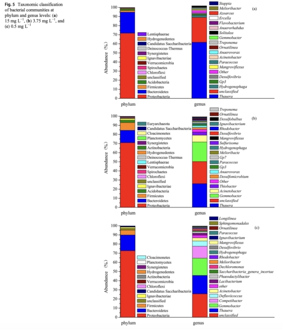 4. 微生物群落分析:在每個運行階段結束時,采集活性污泥樣品,通過高通量測序技術(Illumina HiSeq)分析微生物群落結構,特別是反硝化聚磷菌(DPAOs)和糖原積累菌(GAOs)的豐度變化。