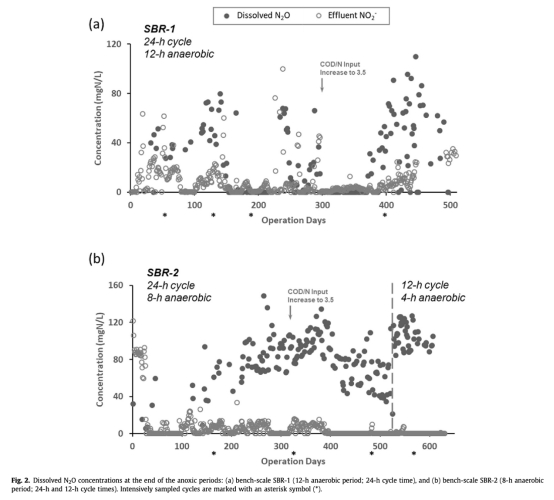 3. 缺氧相的時長需要優(yōu)化以避免N2O被進一步還原為N2。縮短總循環(huán)時間(至12小時)有助于維持高的N2O產(chǎn)率。