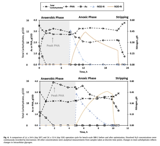2. 厭氧相的時長對PHA的合成與利用效率至關(guān)重要。縮短厭氧相(至4-8小時)可以防止PHA的發(fā)酵損失,使其更有效地在后續(xù)缺氧相中被用于將NO2-還原為N2O。