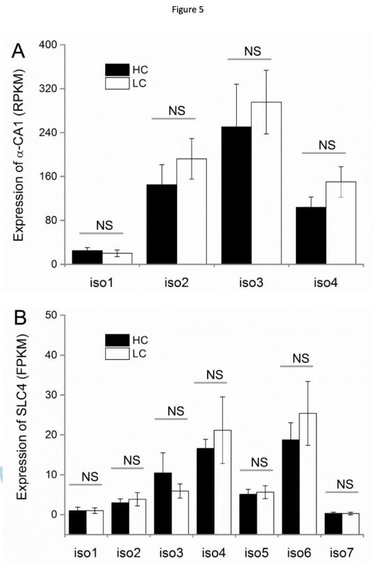 4. 基因表達數(shù)據(jù)(來自圖5):通過轉(zhuǎn)錄組學分析,獲得了編碼α-CA1(圖5A)和SLC4轉(zhuǎn)運蛋白(圖5B)的基因轉(zhuǎn)錄本表達量(RPKM/FPKM)。該數(shù)據(jù)從分子水平證實了這些關(guān)鍵基因的存在,并且它們的表達在不同CO?條件下(HC vs LC)沒有顯著差異,與水車前“組成型”HCO??利用能力的生理現(xiàn)象相一致。