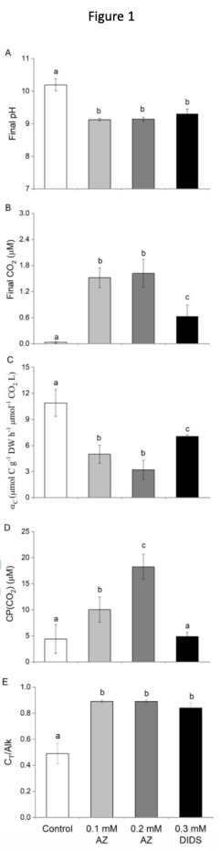 1. pH漂移終點參數(shù)(來自圖1):測量了對照組和抑制劑(AZ, DIDS)處理組的最終pH值(圖1A)、最終CO?濃度(圖1B)。該數(shù)據(jù)直接證明了水車前具有強大的HCO??利用能力(對照組最終pH極高,CO?極低),而AZ和DIDS處理均抑制了這種能力,表明CAext和AE蛋白是HCO??利用所必需的。