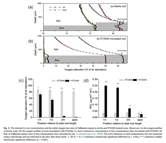c. 徑向氧損失(ROL)速率:根據氧濃度剖面計算得出。研究意義:定量表示根部向根際釋放氧氣的速率,顯示KT2440刺激了特定區域(如根長1/4處)的ROL,但同時由于內部氧被消耗,總體ROL模式發生改變,根尖ROL速率反而降低。