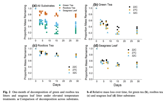 1. 剩余質(zhì)量比例與分解速率(k)(圖2, 圖3):測(cè)量了不同時(shí)間點(diǎn)各凋落物的干重剩余比例,并計(jì)算了指數(shù)衰減常數(shù)k。研究意義:直接量化了溫度升高對(duì)不同穩(wěn)定性凋落物分解速率的影響。結(jié)果顯示綠茶分解最快,海草次之,路易波士茶最慢;升溫(尤其是32°C)顯著促進(jìn)了所有凋落物的質(zhì)量損失,但這種效應(yīng)在時(shí)間上和程度上因底物穩(wěn)定性而異(如綠茶早期響應(yīng)快,路易波士茶和海草后期響應(yīng)更明顯)。